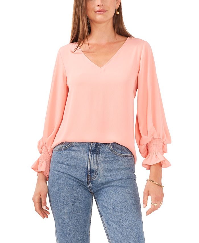 Add a touch of romance to your look with this Vince Camuto top, in a versatile solid color with softly ruffed bubble sleeves.