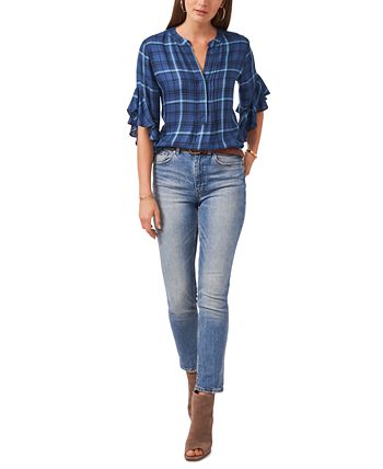 Flowing ruffles deliver a chic twist on classic plaid with this henley-style top from Vince Camuto.